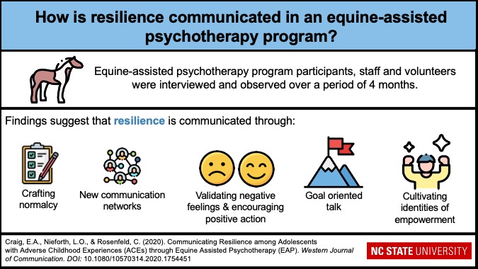 Craig, E., Nieforth, L., & Rosenfeld, C. (2020). Communicating resilience among adolescents with adverse childhood experiences (ACEs) through equine assisted psychotherapy (EAP). Western Communication. doi: 10.1080/10570314.2020.1754451