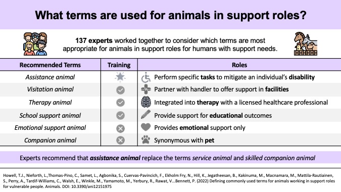 Howell, T.J., Nieforth, L.,Thomas-Pino, C., Samet, L., Agbonika, S., Cuervas-Pavincich, F., Ekholm Fry, N., Hill, K., Jegatheesan, B., Kakinuma, M., Macnamara, M., Mattila-Rautiainen, S., Perry, A., Tardif-Williams, C., Walsh, E., Winkle, M., Yamamoto, M., Yerbury, R., Rawat, V…Bennett, P. (2022) Defining commonly used terms for animals working in support roles for vulnerable people. Animals. doi: 10.3390/ani12151975