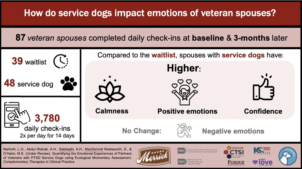 Nieforth, L.O., Abdul Wahab,A.H., Sabbaghi, A.H., MacDermid Wadsworth, S., Foti, D. & O’Haire, M.E. (2022). Quantifying the emotional experiences of partners of veterans with PTSD service dogs using ecological momentary assessment. Complementary Therapies in Clinical Practice. doi: 10.1016/j.ctcp.2022.101590