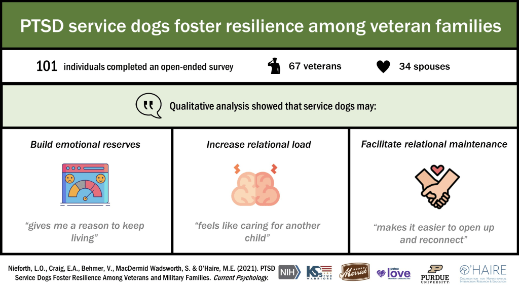 Nieforth, L.O., Craig, E.A., MacDermid Wadsworth, S., Behmer, V. & O’Haire, M.E. (2023). PTSD service dogs foster resilience among veterans and military families. Current Psychology. doi:10.1007/s12144-021-01990-3
