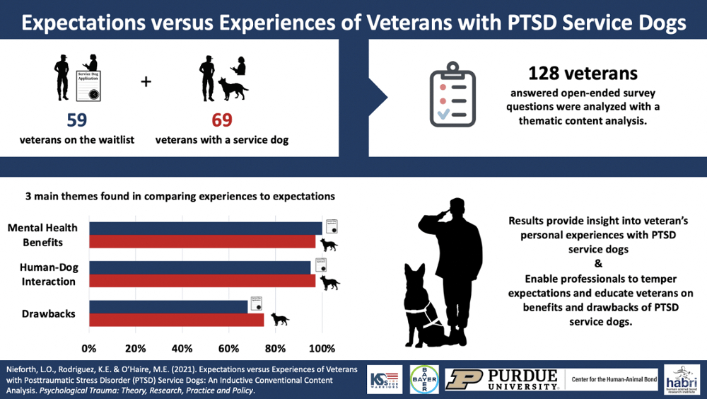 Nieforth, L.O., Rodriguez, K.E. & O’Haire, M.E. (2021). Expectations versus experiences of veterans with posttraumatic stress disorder service dogs: A conventional content analysis. Psychological Trauma: Theory, Research, Practice, and Policy. doi:10.1037/tra0001021