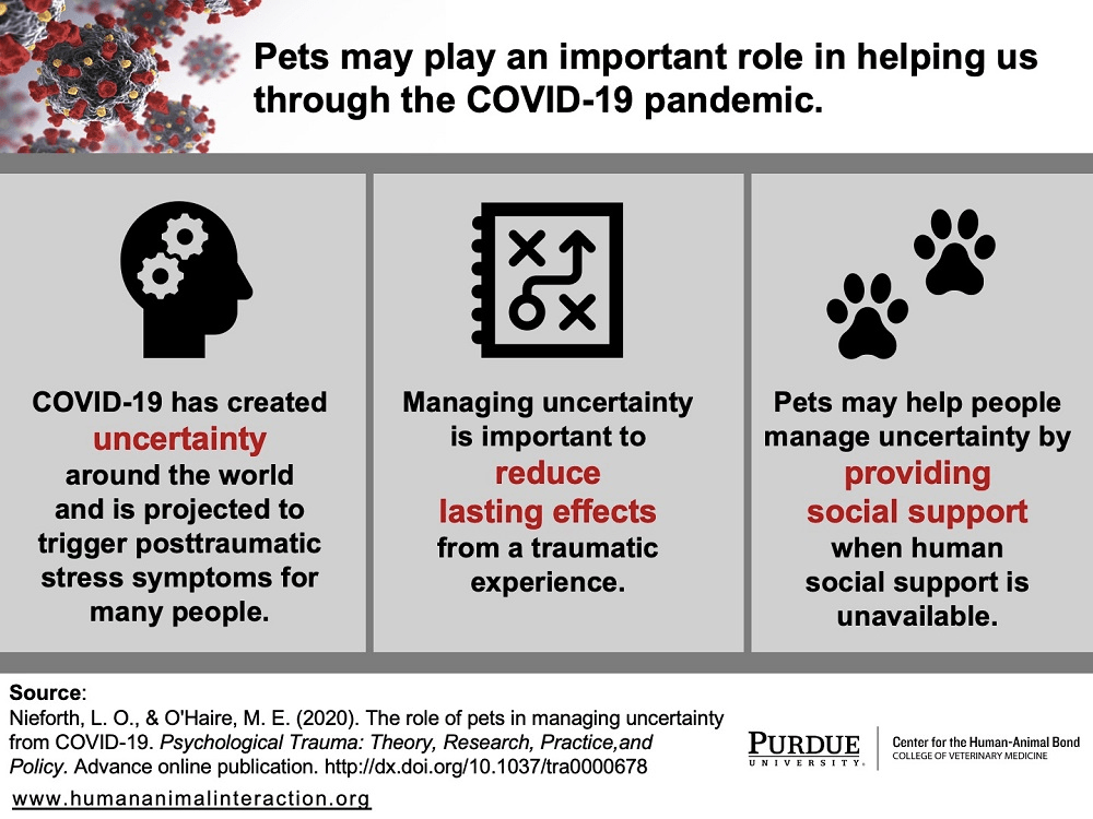 Nieforth, L.O. & O’Haire, M.E. (2020). The role of pets in managing uncertainty from COVID-19. Psychological Trauma: Theory, Research, Practice, and Policy. doi: 10.1037/tra0000678