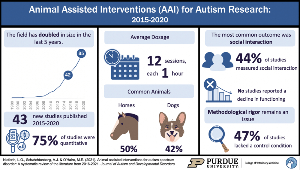 Nieforth, L.O., Schwichtenberg, A.J. & O’Haire, M.E. (2023). Animal assisted interventions for autism spectrum disorder: A systematic review of the literature from 2016-2020. Review Journal of Autism and Developmental Disorders. doi:10.1007/s40489-021-00291-6