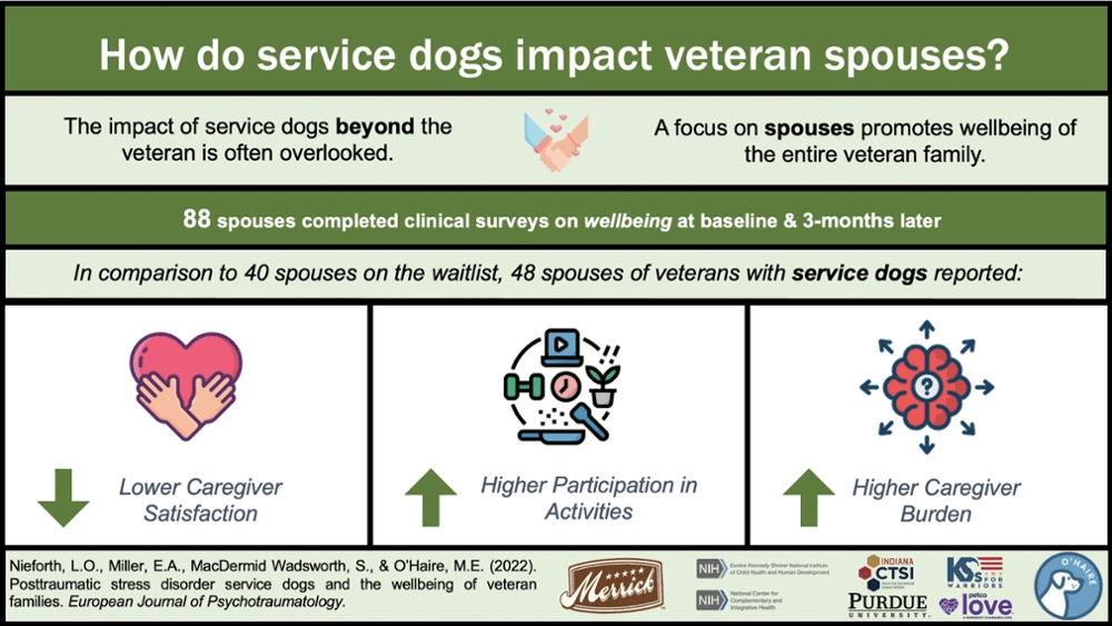 Nieforth, L.O., Miller, E., MacDermid Wadsworth, & O’Haire, M.E. (2022). The effects of a service dog on the wellbeing of veteran families. European Journal of Psychotraumatology. doi: 10.1080/20008198.2022.2062997