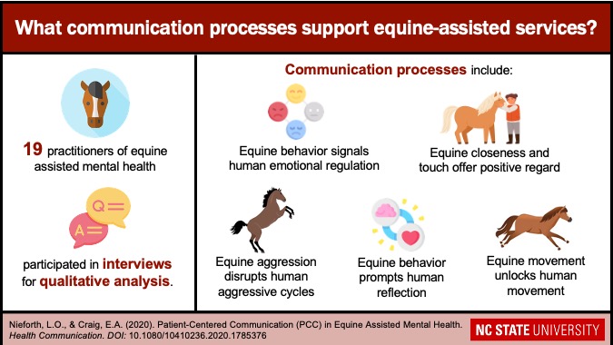Nieforth, L., Craig, E. (2020). Patient-centered communication (PCC) in equine assisted mental health. Health Communication. doi: 10.1080/10410236.2020.1785376