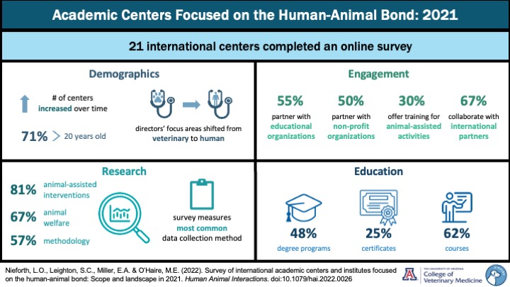 Nieforth, L.O., Leighton, S.C., Miller, E.A. & O’Haire, M.E. (2022). Survey of international academic centers and institutes focused on human-animal bond: Scope and landscape in 2021. Human Animal Interactions. https://doi.org/10.1079/hai.2022.0026