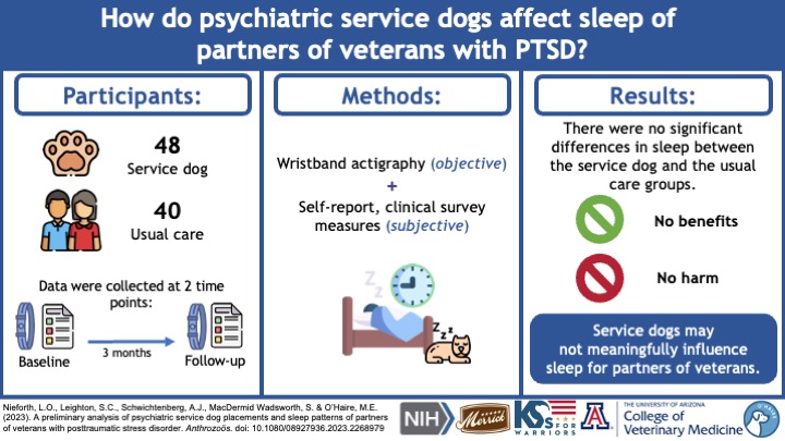 M.E. (2023). A preliminary analysis of psychiatric service dog placements and sleep patterns of partners of veterans with posttraumatic stress disorder. Anthrozoos. https://doi.org/10.1080/08927936.2023.2268979.
