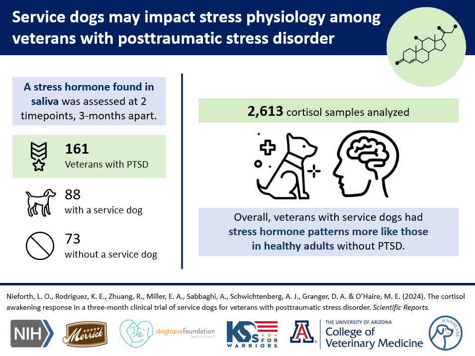 Nieforth, L.O., Rodriguez, K.E., Zhuang, R., Miller, E.A., Sabbaghi, A., Schwichtenberg, A.J., Granger, D.A. & O’Haire, M.E. (2024). The cortisol awakening response in a three-month clinical trial of service dogs for veterans with posttraumatic stress disorder. Scientific Reports. https://doi.org/10.1038/s41598-023-50626-y