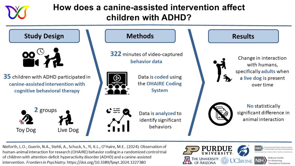 Nieforth, L.O., Guerin, N.A., Stehli, A., Schuck, S., Yi, K.L., O’Haire, M.E.. (2024). Observation of human-animal interaction for research (OHAIRE) behavior coding in a randomized control trial of children with attention-deficit hyperactivity disorder (ADHD) and a canine-assisted intervention. Frontiers in Psychiatry. https://doi.org/10.3389/fpsyt.2024.1327380
