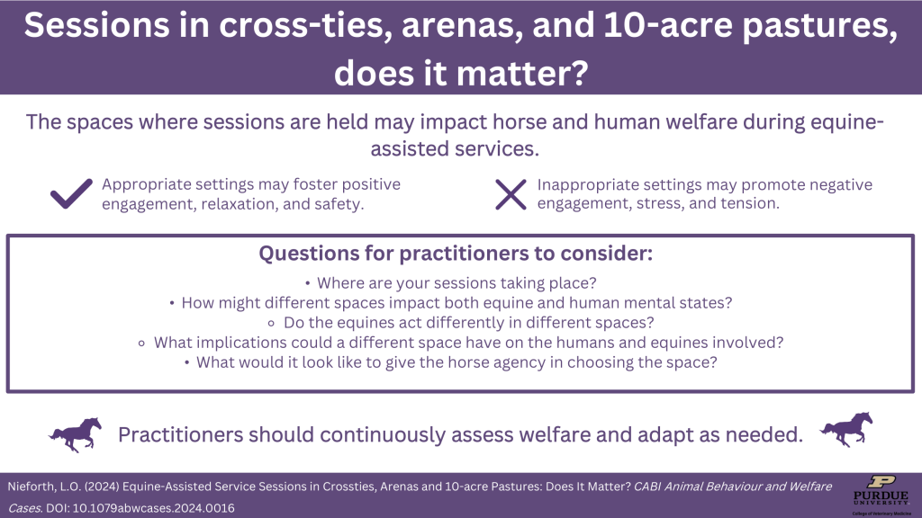 Nieforth, L.O. (2024). Equine-assisted service sessions in crossties, arenas and 10-acre pastures: Does it matter? CABI Animal Behaviour and Welfare Cases. https://doi.org/10.1079/abwcases.2024.0016