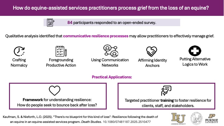 Kaufman, S. & Nieforth, L.O. (2025). “There’s no blueprint for this kind of loss”: Resilience following the death of an equine in an equine-assisted services program. Death Studies. https://doi.org/10.1080/07481187.2025.2510477