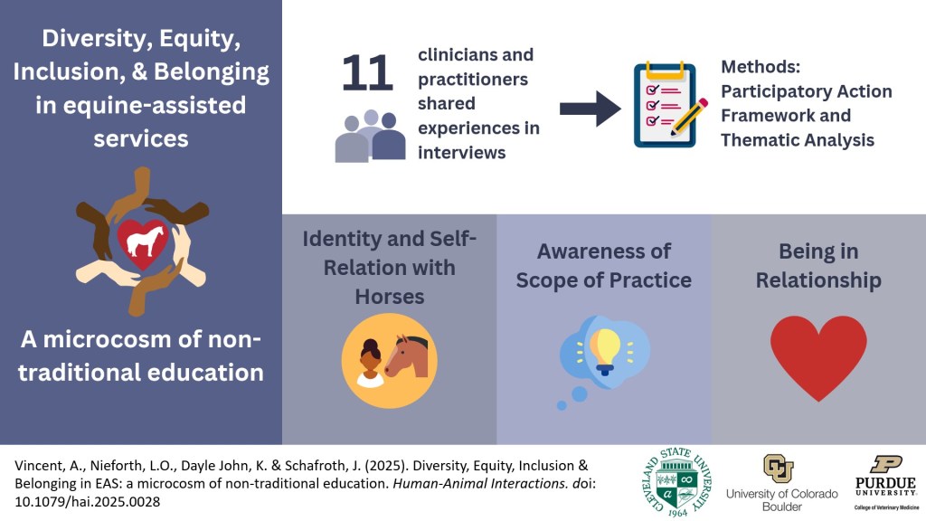 Vincent, A., Nieforth, L.O., Dayle John, K. & Schafroth, J. (2025). Diversity, Equity, Inclusion & Belonging in EAS: a microcosm of non-traditional education. Human-Animal Interactions. https://doi.org/10.1079/hai.2025.0028
